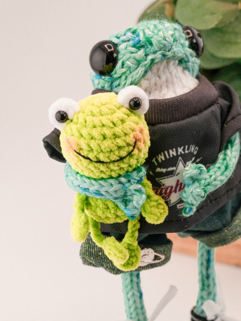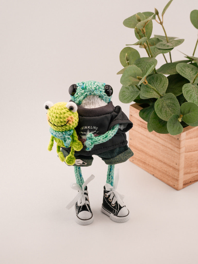 Your frog comes just as shown, complete with outfit, shoes, and accessories, plus a few extra surprises depending on what they’ve packed for their journey 🧳