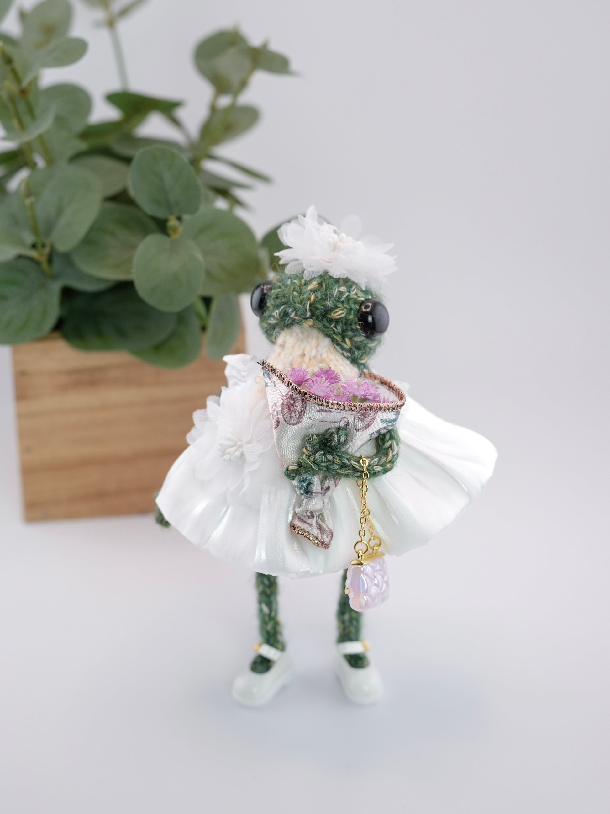 Your frog comes just as shown, complete with outfit, shoes, and accessories, plus a few extra surprises depending on what they’ve packed for their journey 🧳