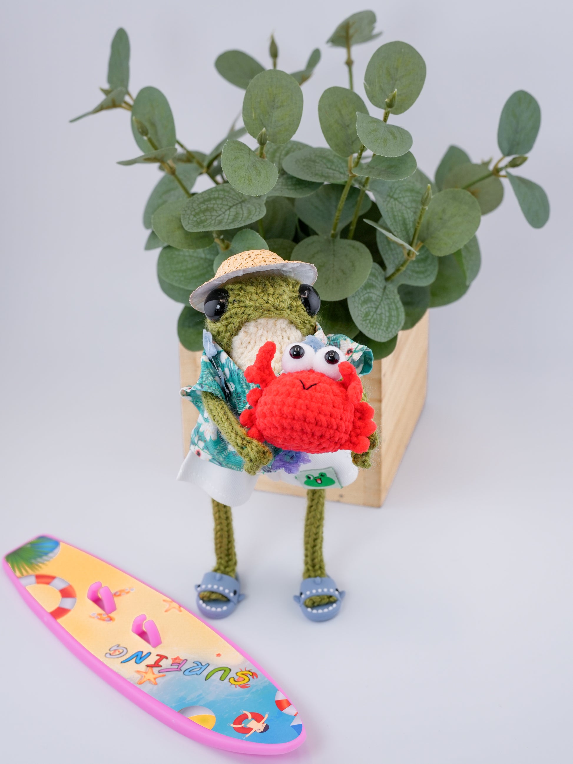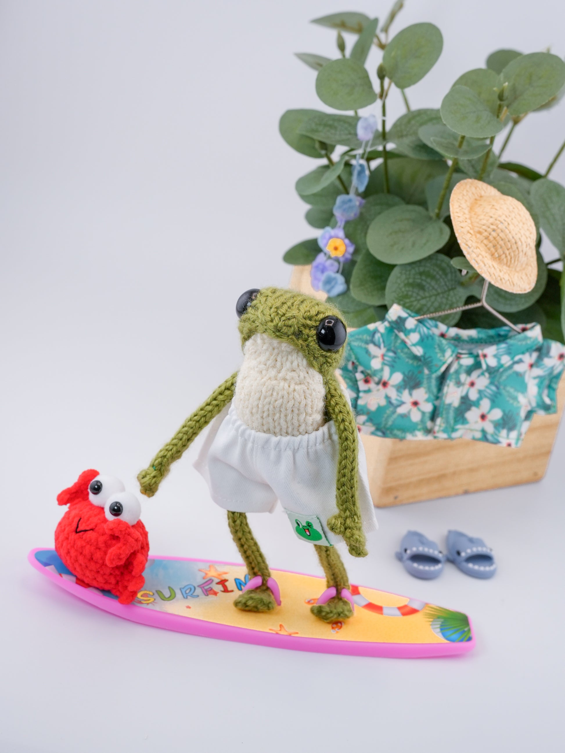 Your frog comes just as shown, complete with outfit, shoes, and accessories, plus a few extra surprises depending on what they’ve packed for their journey 🧳