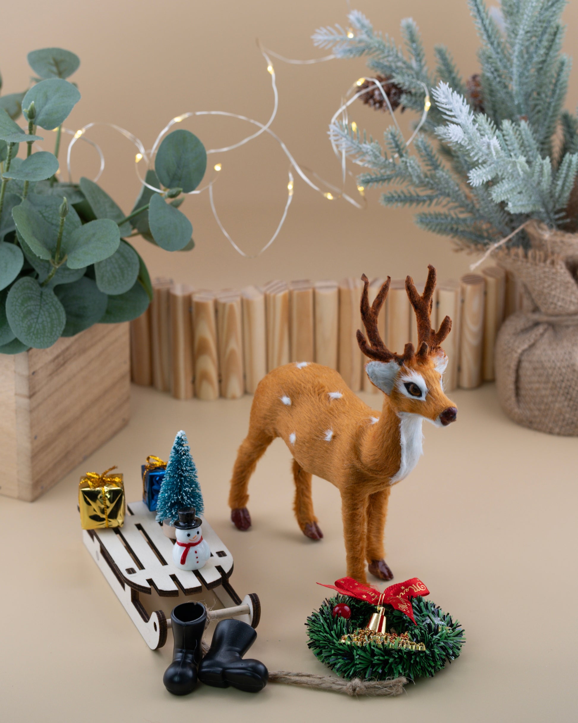 The set comes with charming winter accessories: a wooden sled, tiny boots, a Christmas wreath, a mini cocoa cup, and a little snowman - everything needed for a magical winter moment. Each piece adds warmth, playfulness, and storytelling charm to your display.