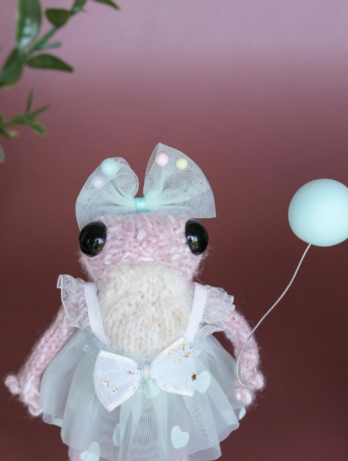 Your frog comes just as shown, complete with outfit, shoes, and accessories, plus a few extra surprises depending on what they’ve packed for their journey 🧳