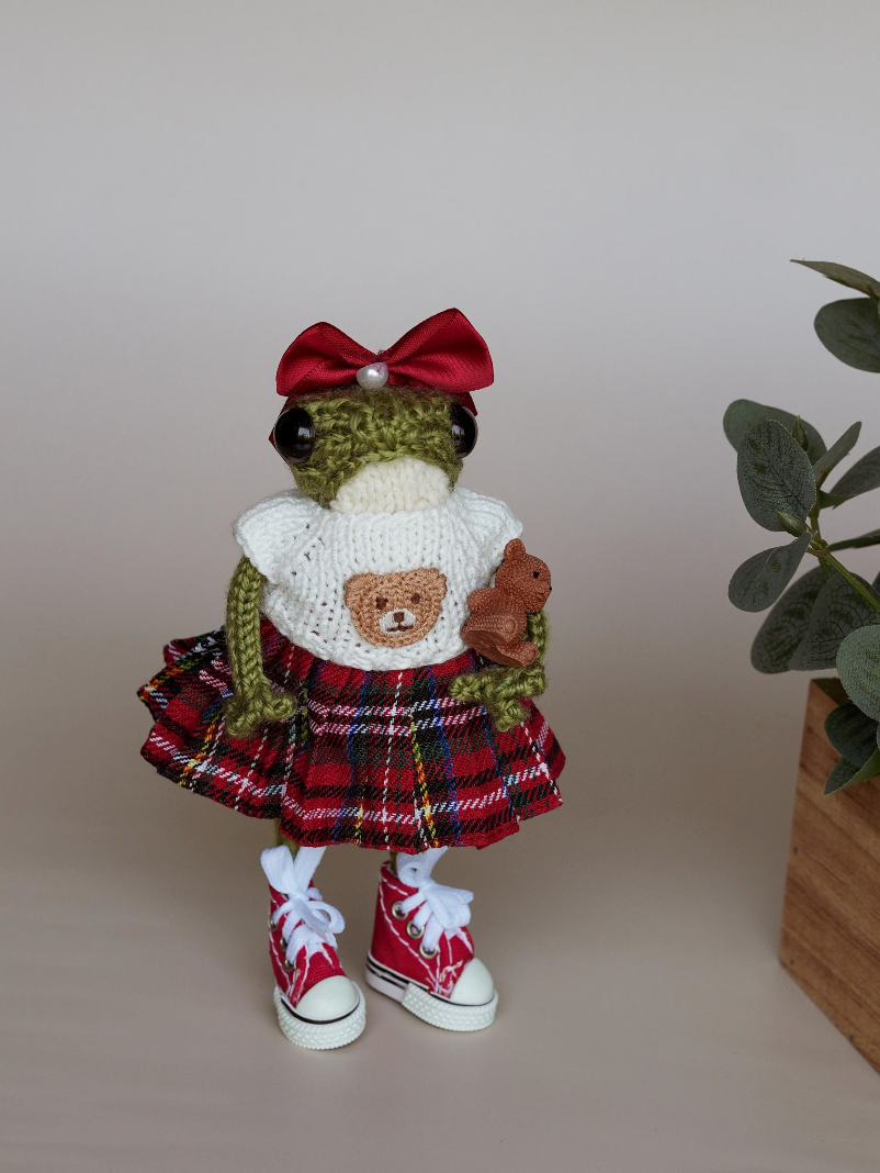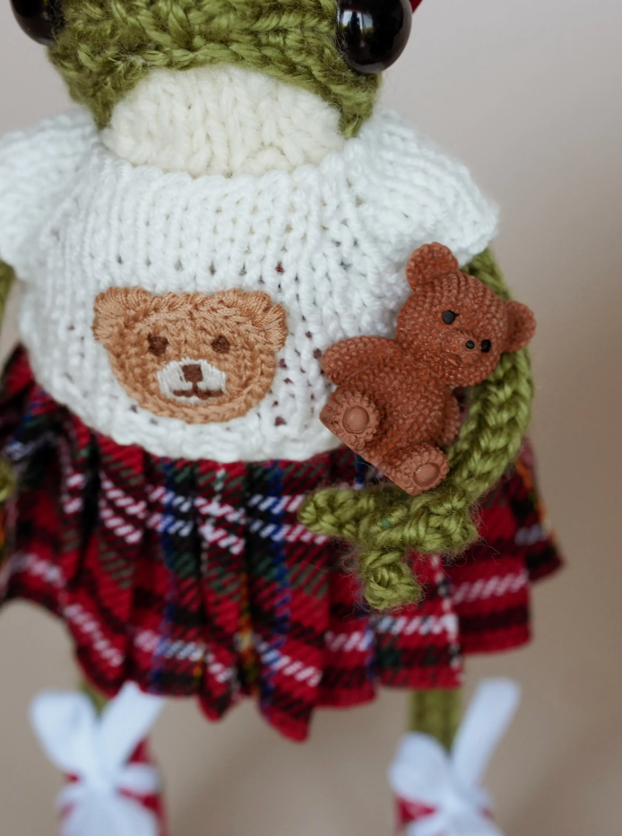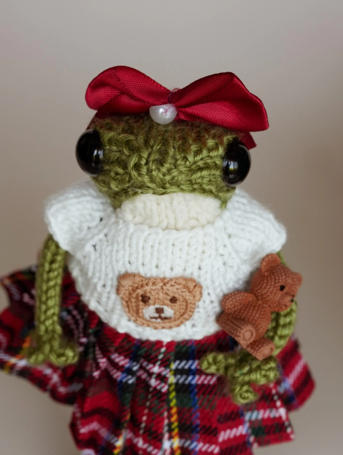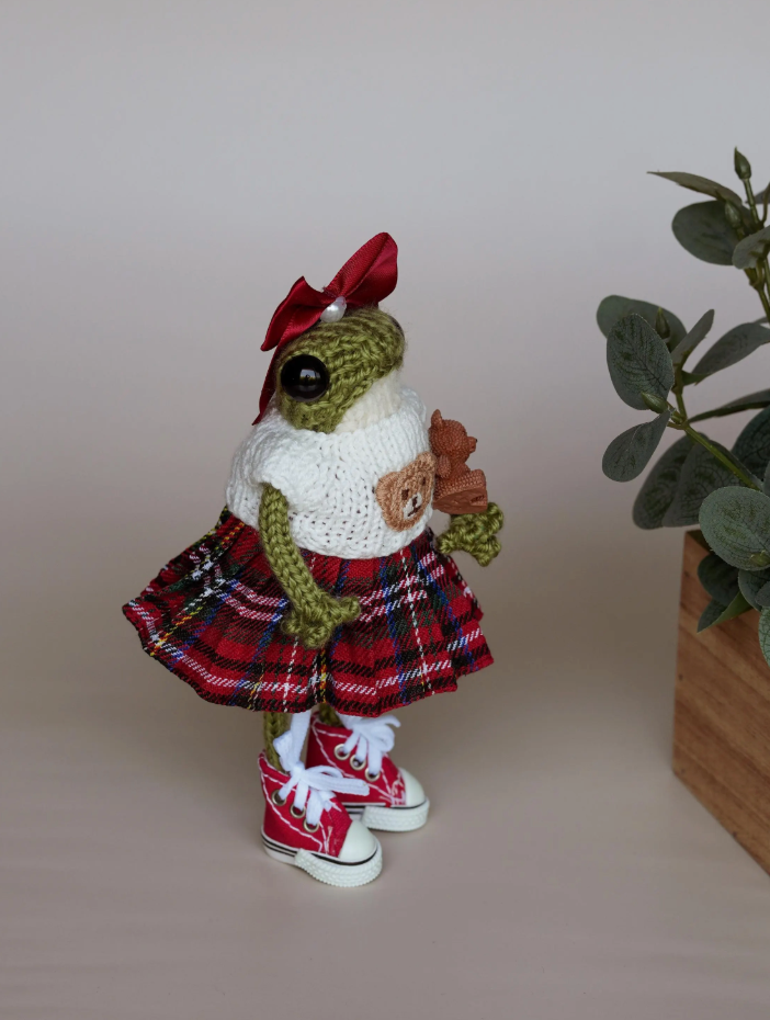 Your frog comes just as shown, complete with outfit, shoes, and accessories, plus a few extra surprises depending on what they’ve packed for their journey 🧳